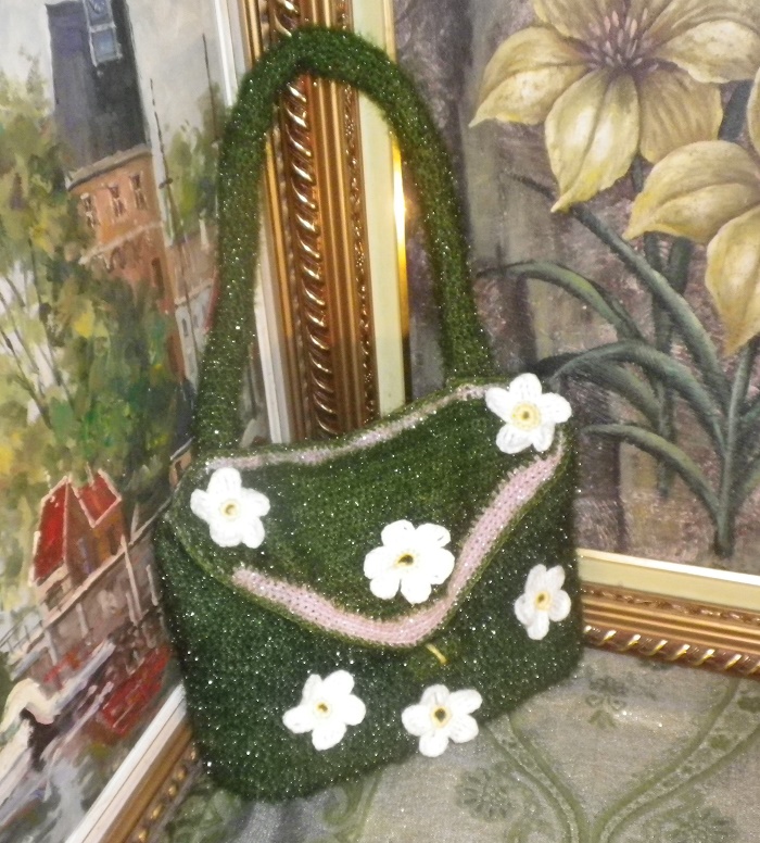 Çantë ngjyrë jeshile me shkëlqim në formë zarfi e punuar me akrelik...
